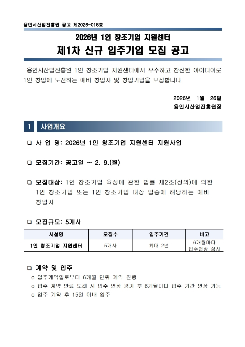 2026년 1인 창조기업 지원센터 제1차 신규 입주기업 모집(~2/9(월))